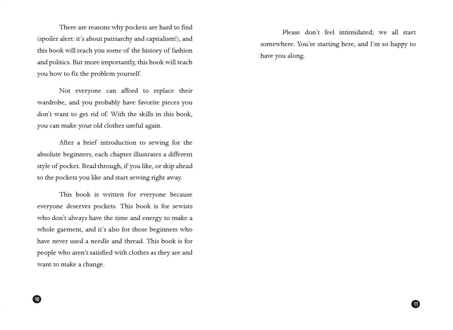 Transform your wardrobe with this step-by-step guide to sewing pockets into your favorite clothes. With simple instructions and line drawings, this book teaches six basic pockets, with suggested alterations to customize your wardrobe, while learning the history of what pockets looked like and why they remain a political tool today. All projects are designed for beginner sewists and most can be made by hand, no specialty tools or machine required. For every pair of pants with the pockets sewn shut, for every skirt with nowhere to put your hands, for every jacket missing a place to put your cash, there's one dress with pockets big enough to hold your entire world. But clothes with pockets should not be so rare. With the skills in this book, you can make your old clothes useful again. Everyone deserves pockets!