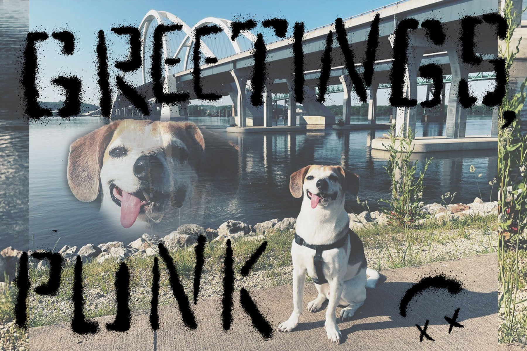 MOODY original postcard, featuring our beloved lazy intern Sir Snoopis Amadeus near the iconic new I-74 bridge, connecting Illinois & Iowa on the good ol’ Mississippi River!